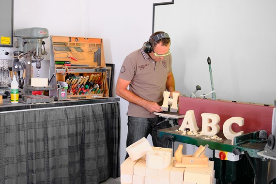 Die Bearbeitung und Verarbeitung des lebendigen Werkstoffes Holz steht im Mittelpunkt unserer Arbeit. Jeder Buchstabe wird individuell von Hand im Hunsrück gefertigt, verarbeitet und angemalt.